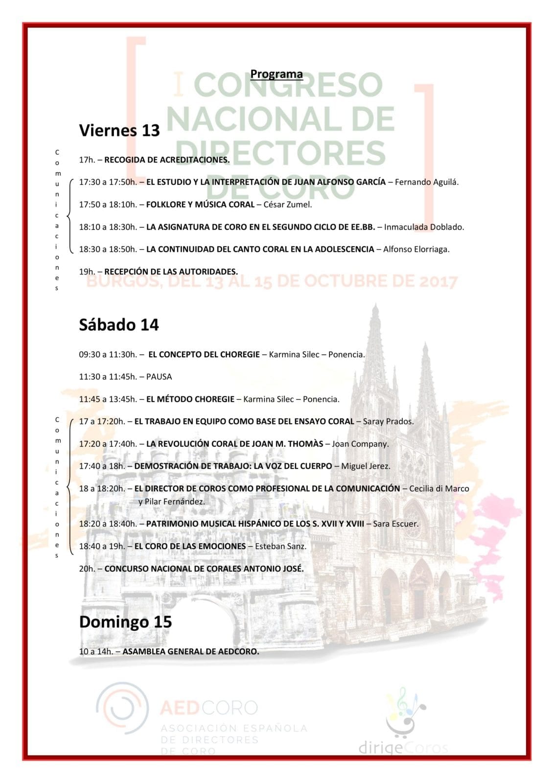 Tendrá lugar en la ciudad de Burgos, del 13 al 15 de octubre del 2017, con la principal finalidad de constituir un foro de intercambio de conocimientos y experiencias entre directores, compositores y miembros en general de la amplia comunidad coral que existe en España.